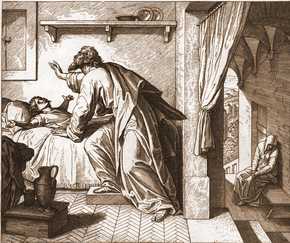 Некоторый человек был богат, одевался в порфиру и виссон и каждый день пиршествовал блистательно. Был также некоторый нищий, именем Лазарь, который лежал у ворот его в струпьях и желал напитаться крошками, падающими со стола богача, и псы, приходя, лизали струпья его. Умер нищий и отнесён был Ангелами на лоно Авраамово. Умер и богач, и похоронили его. И в аде, будучи в муках, он поднял глаза свои, увидел вдали Авраама и Лазаря на лоне его и, возопив, сказал: отче Аврааме! умилосердись надо мною и пошли Лазаря, чтобы омочил конец перста своего в воде и прохладил язык мой, ибо я мучаюсь в пламени сем. Но Авраам сказал: чадо! вспомни, что ты получил уже доброе твоё в жизни твоей, а Лазарь – злое; ныне же он здесь утешается, а ты страдаешь; и сверх всего того между нами и вами утверждена великая пропасть, так что хотящие перейти отсюда к вам не могут, также и оттуда к нам не переходят. Тогда сказал он: так прошу тебя, отче, пошли его в дом отца моего, ибо у меня пять братьев; пусть он засвидетельствует им, чтобы и они не пришли в это место мучения. Авраам сказал ему: у них есть Моисей и пророки: пусть слушают их. Он же сказал: нет, отче Аврааме, но если кто из мёртвых придёт к ним, покаются. Тогда Авраам сказал ему: если Моисея и пророков не слушают, то если бы кто и из мёртвых воскрес, не поверят.