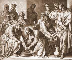 Перед праздником Пасхи Иисус, зная, что пришёл час Его перейти от мира сего к Отцу, явил делом, что, возлюбив Своих сущих в мире, до конца возлюбил их. И во время вечери, когда диавол уже вложил в сердце Иуде Симонову Искариоту предать Его, Иисус, зная, что Отец всё отдал в руки Его, и что Он от Бога исшёл и к Богу отходит, встал с вечери, снял с Себя верхнюю одежду и, взяв полотенце, препоясался. Потом влил воды в умывальницу и начал умывать ноги ученикам и отирать полотенцем, которым был препоясан. Подходит к Симону Петру, и тот говорит Ему: Господи! Тебе ли умывать мои ноги? Иисус сказал ему в ответ: что Я делаю, теперь ты не знаешь, а уразумеешь после. Пётр говорит Ему: не умоешь ног моих вовек. Иисус отвечал ему: если не умою тебя, не имеешь части со Мною. Симон Пётр говорит Ему: Господи! не только ноги мои, но и руки и голову. Иисус говорит ему: омытому нужно только ноги умыть, потому что чист весь; и вы чисты, но не все. Ибо знал Он предателя Своего, потому и сказал: не все вы чисты.