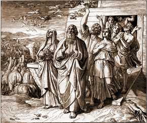 Вода постоянно убывала до десятого месяца; в первый день десятого месяца показались верхи гор. По прошествии сорока дней Ной открыл сделанное им окно ковчега и выпустил ворона, [чтобы видеть, убыла ли вода с земли,] который, вылетев, отлетал и прилетал, пока осушилась земля от воды. Потом выпустил от себя голубя, чтобы видеть, сошла ли вода с лица земли, но голубь не нашёл места покоя для ног своих и возвратился к нему в ковчег, ибо вода была ещё на поверхности всей земли; и он простёр руку свою, и взял его, и принял к себе в ковчег. И помедлил еще семь дней других и опять выпустил голубя из ковчега. Голубь возвратился к нему в вечернее время, и вот, свежий масличный лист во рту у него, и Ной узнал, что вода сошла с земли. Он помедлил ещё семь дней других и [опять] выпустил голубя; и он уже не возвратился к нему. Шестьсот первого года [жизни Ноевой] к первому [дню] первого месяца иссякла вода на земле; и открыл Ной кровлю ковчега и посмотрел, и вот, обсохла поверхность земли. И во втором месяце, к двадцать седьмому дню месяца, земля высохла. И сказал [Господь] Бог Ною: выйди из ковчега ты и жена твоя, и сыновья твои, и жёны сынов твоих с тобою; выведи с собою всех животных, которые с тобою, от всякой плоти, из птиц, и скотов, и всех гадов, пресмыкающихся по земле: пусть разойдутся они по земле, и пусть плодятся и размножаются на земле. И вышел Ной и сыновья его, и жена его, и жёны сынов его с ним; все звери, и [весь скот, и] все гады, и все птицы, всё движущееся по земле, по родам своим, вышли из ковчега.