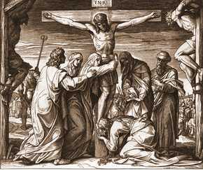 Иисус, увидев Матерь и ученика тут стоящего, которого любил, говорит Матери Своей: Жено! се, сын Твой. Потом говорит ученику; се, Матерь твоя! И с этого времени ученик сей взял Её к себе. После того Иисус, зная, что уже всё совершилось, да сбудется Писание, говорит: жажду. Тут стоял сосуд, полный уксуса. Воины, напоив уксусом губку и наложив на иссоп, поднесли к устам Его. Когда же Иисус вкусил уксуса, сказал: совершилось! И, преклонив главу, предал дух.