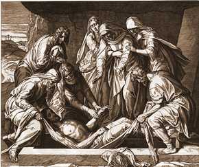 После сего Иосиф из Аримафеи – ученик Иисуса, но тайный из страха от иудеев, – просил Пилата, чтобы снять тело Иисуса; и Пилат позволил. Он пошёл и снял тело Иисуса. Пришёл также и Никодим, – приходивший прежде к Иисусу ночью, – и принёс состав из смирны и алоя, литр около ста. Итак они взяли тело Иисуса и обвили его пеленами с благовониями, как обыкновенно погребают иудеи. На том месте, где Он распят, был сад, и в саду гроб новый, в котором ещё никто не был положен. Там положили Иисуса ради пятницы Иудейской, потому что гроб был близко.