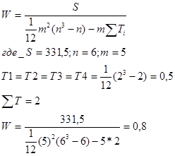 При расчете коэффициента конкордации получаем значение 0,8, что говорит о наличии высокой степени согласованности мнений экспертов.