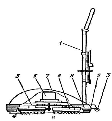 а-конструкция: 1- штанга управления,2- переходник, 3- колёса, 4-приводной ремень, 5- основание, 6- электродвигатель, 7- кожух, 8-щёткодержатель, 9-бампер