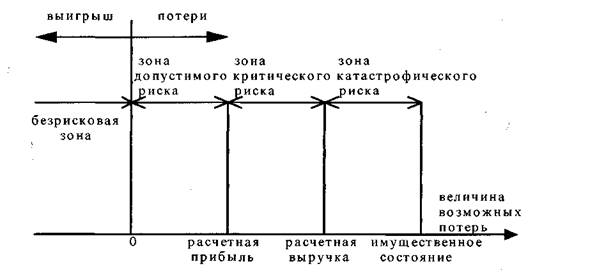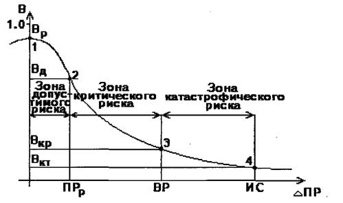 Следовательно, главное в оценке хозяйственного риска состоит в искусстве построения кривой вероятностей возможных потерь или хотя бы определении зон и показателей допустимого, критического и катастрофического риска.