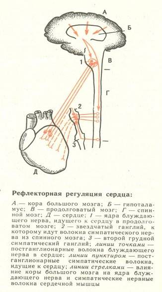Рефлекторная регуляция функций сердца обеспечивается центрами продолговатого и спинного мозга, корой полушарий (моторной и премоторной зоной), а также гипоталамической областью промежуточного мозга.
