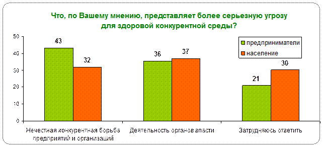 Весьма показательным фактом являются оценки предпринимателями основного источника угрозы для состояния конкурентной среды. При том, что относительное большинство (43%) респондентов считают, что основная угроза исходит от нечестной борьбы между самими субъектами хозяйственной деятельности (предприятиями и организациями), тем не менее, весьма велика и доля тех, кто полагает, что главную опасность здесь представляет деятельность органов власти (так думают 36% предпринимателей).