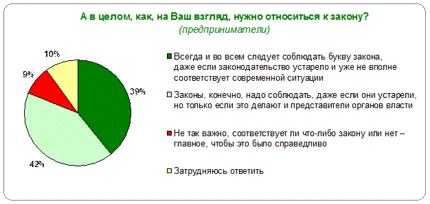 В целом же можно констатировать, что российский бизнес постепенно расстается с образом «дикого капитализма» и медленно дрейфует в сторону цивилизованного предпринимательства. Тем не менее, сохраняется (хотя и в явном меньшинстве) сегмент предпринимательства, которое предпочитает руководствоваться негласными нормами, «понятиями» бизнес-среды, полагая, что «справедливость» важнее закона.
