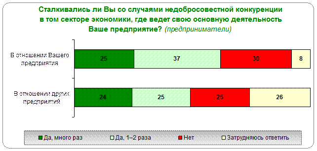 Немало (49%) оказалось и тех, кто знает о случаях нечестной конкурентной борьбы, с которыми сталкивались их коллеги – предприниматели, руководители предприятий и организаций.