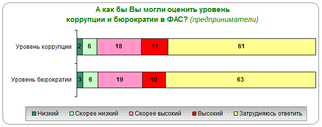 Более 60% респондентов-предпринимателей не в состоянии оценить уровень коррупции и бюрократии в ФАС. Однако те, кто могут это сделать, склонны скептически подходить к работе ведомства – 28-29% респондентов говорят о скорее высокой распространенности этих недостатков, и менее 10% смотрят на ситуацию позитивно.