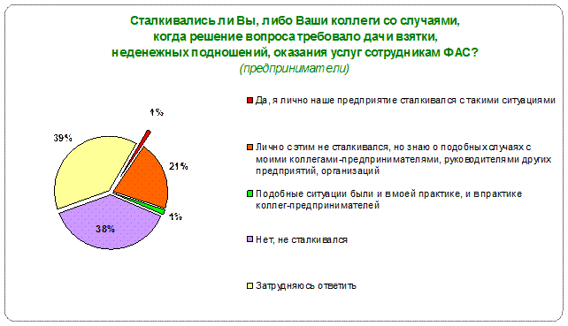 Подавляющее большинство опрошенных представителей бизнес-сообщества сами лично не сталкивались со случаями взяточничества со стороны ФАС – лишь 2% опрошенных были вынуждены давать подношения чиновникам ведомства. 21% судят об этом по косвенным признакам, главным образом, рассказам коллег.