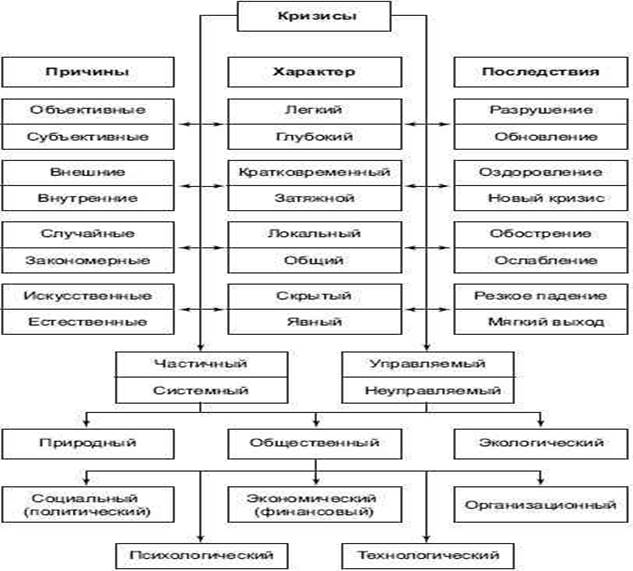 Практика показывает, что кризисы неодинаковы не только по своим причинам и последствиям, но и по своей сути. Необходимость в разветвленной классификации кризисов связана с дифференциацией средств и способов управления ими. Если есть типология и понимание характера кризиса, появляются возможности снижения его остроты, сокращение времени и обеспечение безболезненности протекания.[4]