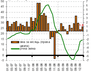 При цьому інфляція за результатами року виявилася значно нижче за очікування економічних агентів та аналітиків різних експертних інститутів. Основними причинами виступали як завищення ефектів переносу девальвації та інфляційних очікувань на ІСЦ, так і припущення щодо значного підвищення тарифів, які регулюються адміністративно.Припинення відтоку депозитів з банківської системи дозволило більш ефективно управляти ліквідністю, що сприяло стабілізації ситуації на валютному ринку. Укріплення обмінного курсу гривні у ІV кварталі 2009 року стало головним фактором зниження річних темпів росту вузької базової інфляції до 12.8% (0.3% - у грудні). Так як вузька базова інфляція відображає світовий інфляційний розвиток та нашу конкурентоспроможність, то можна очікувати зниження інфляційного тиску.