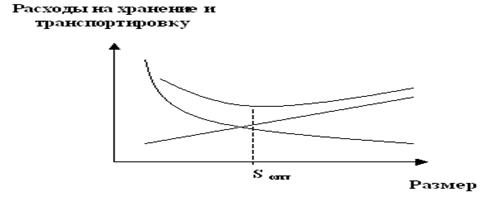 Сложив оба графика, получим кривую, отражающую характер зависимости совокупных издержек по транспортировке и хранению от размера заказываемой партии (рис. 6).