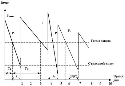 ) и величина страхового запаса. Заказ на поставку размещается при уменьшении наличного запаса до точки заказа. Как следует из чертежа, после размещения заказа запас продолжает уменьшаться, так как заказанный товар привозят не сразу, а через какой-то промежуток времени t. Величина запаса в точке заказа выбирается такой, чтобы в нормальной, рабочей ситуации за время t запас не опустился ниже страхового. Если же спрос непредвиденно увеличится (линия графика резко пойдет вниз - участок А графика), или же будет нарушен срок поставки (t¢ > t- участок В графика), то начнет работать страховой запас. Коммерческая служба предприятия в этом случае должна принять меры, обеспечивающие дополнительную поставку. Как видим, данная система контроля предусматривает защиту предприятия от образования дефицита.