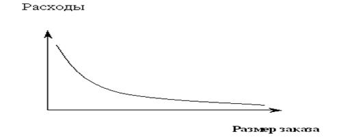 И расходы по доставке, и расходы по хранению зависят от размера заказа, однако, характер зависимости каждой из этих статей расходов от объема заказа разный. Расходы по доставке товаров при увеличении размера заказа уменьшаются, так как перевозки осуществляются более крупными партиями и, следовательно, реже. График этой зависимости, имеющей форму гиперболы, представлен на рис. 4.