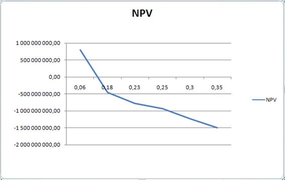 Зависимость чистой текущей стоимости от ставки дисконта представим графически на основе данных из таблицы 13.