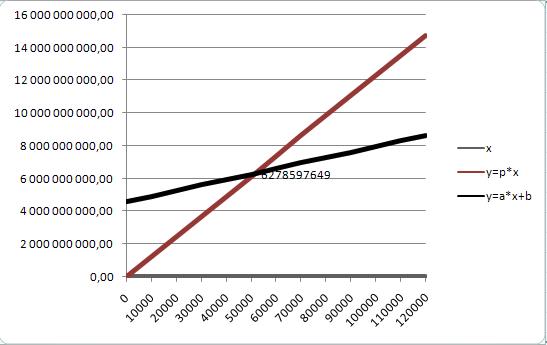 Анализируя график, можно сказать, что точке безубыточности соответствует точка пересечения уравнения реализации и уравнения издержек производства. До перехода точки безубыточности предприятие не получает никакой прибыли, лишь после ее перехода наступает окупаемость всех затрат, и предприятие становится прибыльным. Таким образом минимальный достаточный объем производства равен 6278597649 шт.