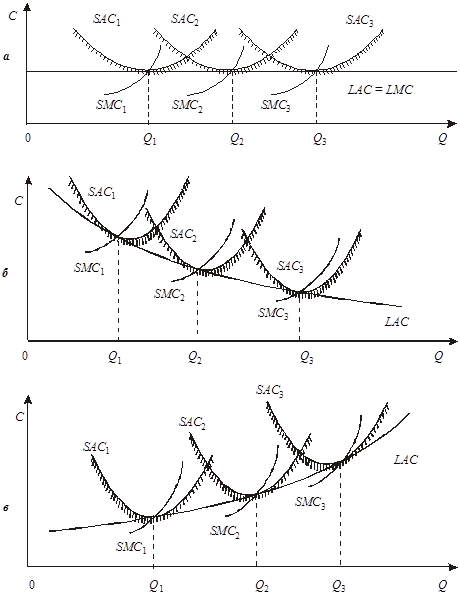 На динаміку витрат у довгостроковому періоді найбільше впливає характер ефекту від зростання масштабів виробництва. Варіанти кривих середніх витрат підприємства у довгостроковому періоді наведено на рис. 2.