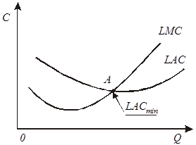 Зауважимо, що навіть за умови зростаючого ефекту від масштабу виробництва фірмі слід збільшувати обсяги виробництва продукції доти, поки потенційні можливості економії на масштабах не будуть вичерпані (точка А на рис. 3).