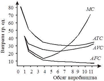 Криві середніх змінних, середніх сукупних і граничних витрат мають U-подібну форму. Це пояснюється дією спадної віддачі змінного фактора виробництва. Тому закон спадної віддачі змінного фактора виробництва тлумачать як закон неухильного збільшення граничних витрат. Зауважимо, що крива граничних витрат перетинає криві середніх сукупних і середніх змінних витрат у точках їх мінімуму.