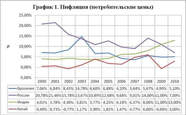 Первой оценкой станет сравнение показателей инфляции стран участниц БРИК с 2000 по 2008 гг.
