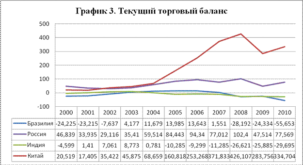 Начиная с 2001 года торговый баланс Бразилии в годовом выражении имеет положительное значение. В совокупности страна является нетто экспортером. Так за последние 10 лет (с 2000 по 2010гг.) наблюдался опережающий рост экспорта, т.е. объемы экспорта выросли на 203%, импорта - на 102%. Однако, следует отметить ускорение роста импорта в последние годы. Так за последние три года (с 2006 по 2010гг.) наблюдается опрежающий рост импорта, т.е. объемы импорта выросли на 92%, тогда как объемы экспорта выросли на 66%. В 2006-2007 гг. товарооборот между Россией и Индией рос быстрыми темпами (примерно 30%), но это достигалось за счет увеличения российского экспорта, в немалой степени - военных поставок. В результате торговый баланс приобрел неприемлемый для Дели отрицательный характер. Дефицит торгового баланса в Индии в феврале 2007 составил 8.9 млрд. Начиная с 2008 по 2009гг положение еще усугубилось и только к концу 2009 - началу 2010 года показатель торгового баланса Индии преодолел нулевой отметку и вновь стал положительным.