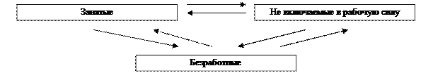 (При этом военнослужащие, находящиеся на действительной воинской службе, хотя формально и относятся к занятым, как правило, при подсчете показателя уровня безработицы не учитываются в общей численности рабочей силы. Этот показатель обычно (если это не оговаривается специально) рассчитывается только для гражданского сектора экономики.) Показатели количества занятых и безработных, численности рабочей силы и численности не включаемых в рабочую силу являются показателями потоков. Между категориями «занятых», «безработных» и «не включаемых в рабочую силу» постоянно происходят перемещения (рисунок 1). Часть занятых теряет место работы, превращаясь в безработных. Некоторая доля безработных находит работу, становясь занятыми. Часть занятых увольняется с работы и покидает общественный сектор экономики (например, выходя на пенсию или становясь домохозяйкой), а часть безработных, отчаявшись, прекращает поиски работы, что увеличивает численность не включаемых в рабочую силу. При этом часть людей, не занятых в общественном производстве, начинает активный поиск работы (неработающие женщины; закончившие высшие учебные заведения студенты; одумавшиеся бродяги). Как правило, в условиях стабильной экономики, количество людей, теряющих работу, равно числу людей, активно ее ищущих.