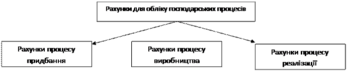 З наукової точки зору, класифікація рахунків повинна будуватись на єдино правильній основі — економічній сутності показників. Ця класифікація спрямована на встановлення номенклатури бухгалтерських рахунків, необхідної для відображення господарської та фінансової діяльності економічного суб’єкта. Рахунки господарських процесів є складовими цієї класифікації. Їхня економічна сутність складається с процесу кругообігу капіталу підприємства, який здійснюється через постачання (купівлі), виробництва продукції та її реалізації [2]. Ці рахунки мають власну структуру (рис.1)
