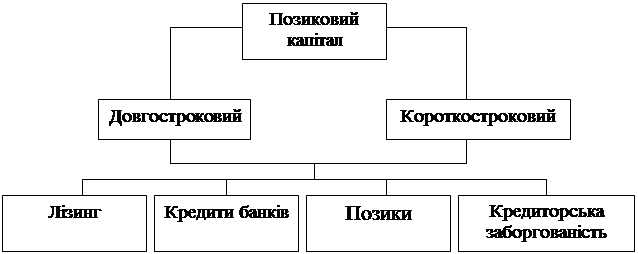 Позиковий капітал – це кредити банків і фінансових компаній, позики, кредиторська заборгованість, лізинг, комерційні папери тощо. Він поділяється на довгостроковий (більше року) і короткостроковий (до року) (рис. 1.2).