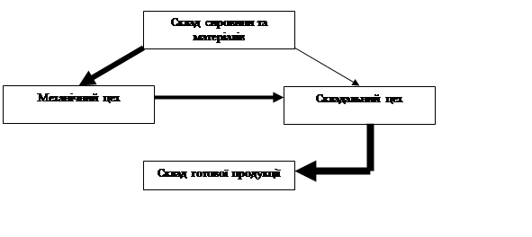 - графічне зображення даних шахової відомості на генеральному плані підприємства (рис 1). При побудові схеми потрібно враховувати, що товщина стрілок повинна бути пропорційна обсягу вантажопотоків.