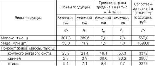 Средний выход продукции на 1 чел.-ч во ΙΙ группе больше на 3,40 руб., или 13,2 %. В то же время производительность труда по двум отраслям во ΙΙ группе в среднем выше на 22,0 %. Поскольку уровни производительности труда по отдельным продуктам и отраслям несопоставимы, то индекс структуры затрат труда 0,928 указывает не на меньший уровень производительности во ΙΙ группе, а на различия из-за несопоставимости совокупностей. Во ΙΙ группе больше доля животноводства, где выход продукции на 1 чел.-ч ниже, что снизило средний показатель на 7,2 %. При различии в структуре производства необходимо сравнить производительность по отдельным продуктам и отраслям, а средний показатель определять только при одинаковой структуре затрат труда.
