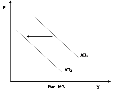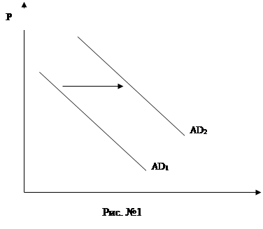 , влияющим на совокупный спрос, относится все, что воздействует на потребительские расходы домашних хозяйств, инвестиционные расходы фирм, государственные расходы, чистый экспорт: благосостояние потребителей, их ожидания, налоги, процентные ставки, субсидии и льготные кредиты инвесторам, колебания валютных курсов, условия на внешних рынках и т.д. Уравнение количественной теории денег дает также два неценовых фактора совокупного спроса: предложение денег M и скорость их обращения V. Изменение неценовых факторов отражается на графике сдвигом кривой AD. Например, увеличение предложения денег (или скорость их обращения) и соответствующий рост платежеспособного спроса в экономике отразятся на графике сдвигом кривой AD вправо (рис. №1), а снижение спроса на нефть на мировом рынке и соответствующее сокращение экспорта отразятся графически сдвигом AD влево (рис. №2).