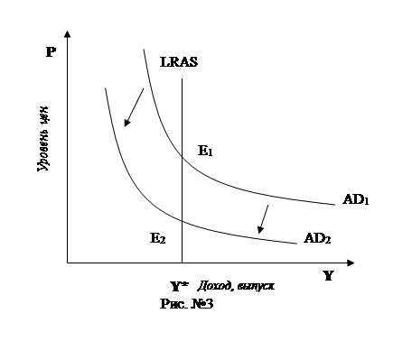 Заметим, сто в случае сокращения совокупного спроса (уменьшение предложения денег, падение государственных расходов, увеличение налогов и т.д.) кривая AD сдвигается влево, показывая снижение выпуска в краткосрочном периоде при относительной устойчивости цен. В дальнейшем корректировка цен в сторону понижения (при Y<Y*, увеличении безработицы, снижения заработной платы и других издержек) постепенно вернет экономику к исходному уровню выпуска. На графике это отразится движением вниз вдоль новой кривой AD до уровня Y*. Но в реальной экономике цены не всегда также легко снижаются, как и растут, поэтому вполне возможно, что величина выпуска восстановится на исходном уровне Y* при более высоком уровне цен, чем это предполагалось теоретически.