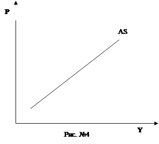 Если номинальная заработная плата достаточно жесткая, а цены относительно гибкие, то их рост, вызванный увеличением совокупного спроса, приведет к падению реальной заработной платы, труд станет дешевле, что будет способствовать росту спроса на труд со стороны фирм. Использование большего количества труда приведет к увеличению выпуска. Таким образом в период, когда номинальная заработная плата не меняется, появляется положительная зависимость между уровнем цен и объемом выпуска. Кривая AS в этих условиях имеет положительный наклон (рис. №4).