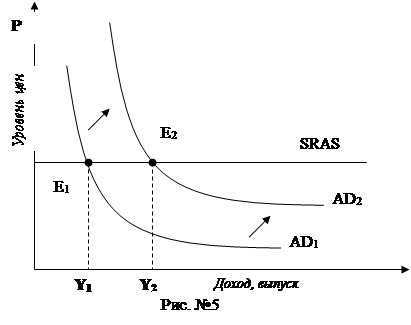 Если правительство хочет увеличить объем выпуска в экономике, то, согласно кейнсианскому подходу, оно должно стимулировать совокупный спрос при помощи фискальной и денежной политики – например, увеличить государственные расходы, снизить налоги, расширить предложение денег и т.п. (см. рис. №5).