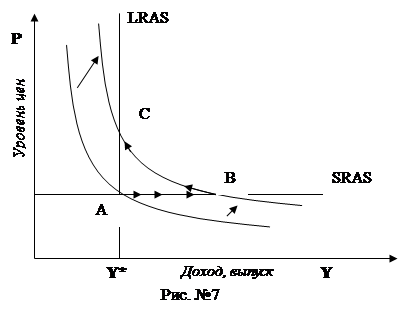 В условиях неполной занятости факторов рост совокупного спроса может длительное время стимулировать увеличение совокупного предложения, вплоть до достижения потенциального уровня выпуска. Дальнейшее увеличение совокупного спроса приведет к последствиям, описанным выше (см. рис. №7).