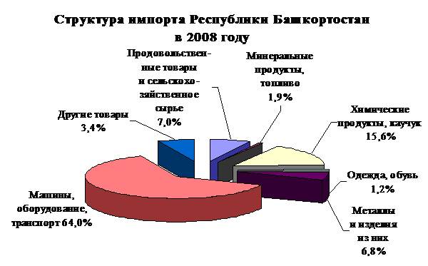 В 2008 году в Республику Башкортостан были импортированы в основном оборудование для производства керамической плитки, запасные части к оборудованию по производству полиэтилена высокой плотности и к оборудованию по производству сыра, задвижки клиновые из стали, используемые на трубопроводах, автомобили легковые, самосвалы, части тормозной системы, продукты неорганической химии и органические химические соединения, сахар-сырец тростниковый и солод ячменный.