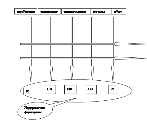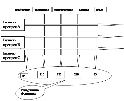 Логистические процессы пронизывают основные подразделения предприятия (закупка, производство, сбыт и т.п.) по горизонтали. Традиционные методы учета, направленные на определение затрат по функциональным областям (по вертикали), не позволяют выделять затраты возникающие в ходе осуществления сквозного процесса, формировать информацию о наиболее значимых затратах, а так же о характере их взаимодействия друг с другом. Известно лишь, во что обходится реализация той или иной функции (рис.3).