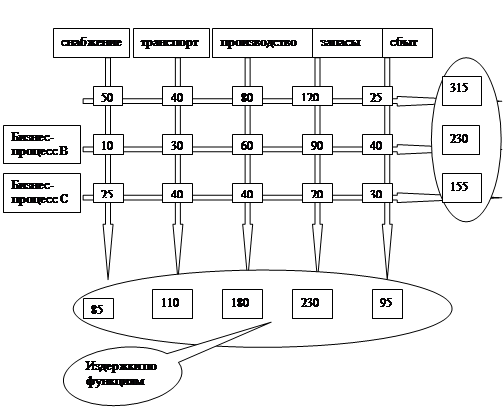 Учет издержек по процессам дает наглядную картину того, как формируются затраты, связанные с обслуживанием клиента, какова доля в них каждого из подразделений. Суммируя все расходы по горизонтали можно определить затраты, связанные с отдельным процессом (рис.4). Таким образом, оказываются детерминированными как показатели сквозного материального потока, так и отдельные специфические издержки, возникающие в различных подразделениях.