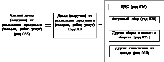 Рисунок-схема № I‑3 Определение чистого дохода от реализации продукции. В статье “ Доход (выручка) от реализации продукции (товаров, работ, услуг)” отображается общий доход (выручка) от реализации продукции, товаров или услуг, то есть без вычета предоставленных скидок, возврата проданных товаров и налогов с продажи (НДС, акцизного сбора, и т.д.), который отвечает критериям определения дохода. В статье “ Налог на добавленную стоимость”указывается сумма налога на добавленную стоимость, которая была включена в состав дохода (выручки) от реализации продукции (товаров, работ, услуг). Предприятия, которые уплачивают другие сборы или налоги с оборота, показывают их сумму в свободном рядке отчета о финансовых результатах. Предоставленные скидки, возврат товаров и другие суммы, которые подлежат отчислению из дохода (выручки) от реализации продукции (товаров, работ, услуг), отображаются в статье “ Другие отчисления из дохода” . Валовая прибыль (убыток) рассчитывается как разница между чистым доходом от реализации продукции (товаров, работ, услуг) и себестоимостью реализованной продукции (товаров, работ, услуг):