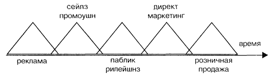 На схеме весь комплекс маркетинговых коммуникаций представлен в виде треугольников: рекламные объявления могут содержать купоны с правом на скидку при покупке рекламируемого товара, что является одной из форм сейлз промоушн. Выставки, относящиеся к сейлз промоушн, могут иметь престижные разделы, т.е. содержать элементы паблик рилейшнз (PR). Директ-маркетинг, основывающийся на установлении прямых связей между производителем и потребителем, может использовать формы распространения репринтов рекламных объявлений (реклама), престижных статей (PR), образцов рекламного товара (сейлз промоушн) и т.д..