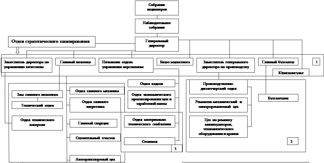 Приемлемой моделью для ОАО «Черметремонт» в настоящее время могла бы стать схема организационной структуры управления с использованием концепции стратегических хозяйственных подразделений (схема З.1.). в основу организационной структуры управления положена модель диверсифицированной организации, ориентированной на стратегическое управление. Этот подход предполагает децентрализацию управления организаций.