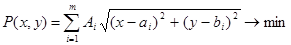 , . Требуется определить координаты склада (центра консолидации) (x, y) так, чтобы сумма расстояний от данных m точек с учетом спроса Ai