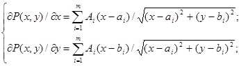 Опишем алгоритм нахождения минимума целевой функции Р(х, у). Возьмем частные производные от Р(х, у):