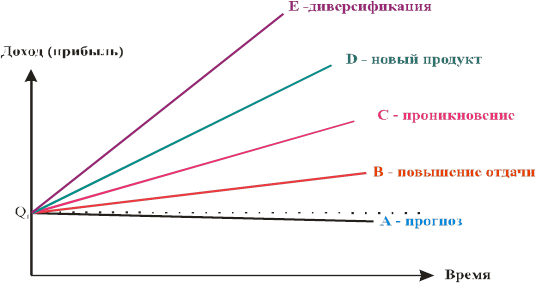 Точка А – прогноз фирмы при неизменной стратегии и постоянстве внешней среды. Точка В – прогноз фирмы при росте продуктивности деятельности без изменения стратегии. Точка С – целевой рост за счет развития существующего рынка. Точка D – целевой рост за счет нового рынка или товара. Точка Е – целевой рост путем диверсификации.