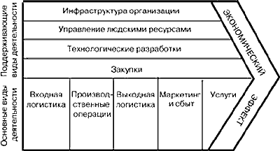 Ценностная цепь включает в свой состав все виды деятельности организации (звенья цепи), направленные на создание ценности для потребителя. В классической модели организации эти виды деятельности включают разработку, производство, маркетинг, сбыт и поддержку своих продуктов. Эти виды деятельности группируются на пять основных видов (входная логистика — обеспечение производственных операций всем необходимым, производственные операции — выпуск готовых продуктов; выходная логистика — обращение с готовыми продуктами; маркетинг, включая сбыт; и услуги) и четыре поддерживающих вида деятельности (инфраструктура организации — обеспечение эффективного управления, финансы, планирование; управление людскими ресурсами; технологические разработки; закупки, предполагающие приобретение всего необходимого для ведения основной деятельности). Поддерживающие виды деятельности касаются ведения всех основных видов деятельности. В более детальной модели каждый из девяти видов деятельности организации в свою очередь может быть конкретизирован; например, маркетинг — по его отдельным функциям: проведение маркетинговых исследований, продвижение продукта, маркетинговая разработка нового продукта и т.д.