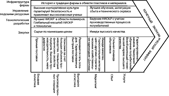 На рисунке 2 приводится в качестве примера ценностная цепь фирмы «Дюпон». Руководство и сотрудники фирмы используют ценностную цепь для лучшей ориентации своей деятельности на запросы потребителей и поиска путей снижения всех видов издержек, чтобы фирма оставалась лидером в конкурентной борьбе.