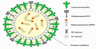 – это пример вируса с «-»-одноцепочечной РНК. У него есть оболочка и спиральная сердцевина. Сердцевина состоит из восьми сегментов «-» РНК, которые в комплексе с белками образуют спиралевидные структуры. Каждый сегмент кодирует один из белков вируса. В наибольшем количестве вирус содержит белок матрикса, располагающийся на внутренней стороне оболочки и придающий ей стабильность. Все белки оболочки кодируются вирусной РНК, тогда как липиды являются по своему происхождению клеточными (см. ДНК-содержащие вирусы, сборка). Основные белки оболочки – гемагглютинин и нейраминидаза.