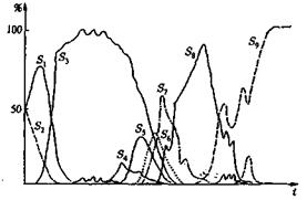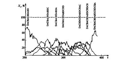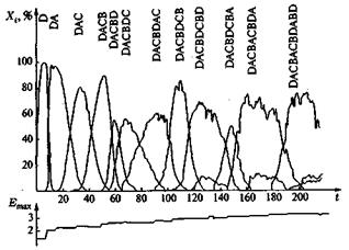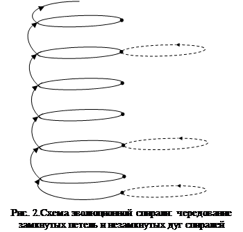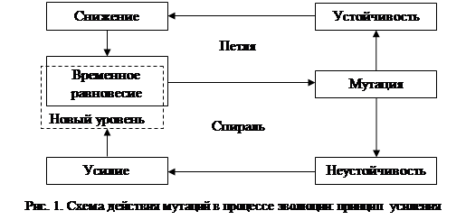 Взаимодействие мутаций и отбора в процессах эволюции разыгрывается по следующей общей схеме. Каждая мутация означает возмущение в установившемся на некоторое время равновесии (рис. 1). Мутант приводит к проверке системы на устойчивость относительно появления нового сорта. Если мутация не дает никаких преимуществ по сравнению с существовавшими ранее сортами, то новый сорт исчезает в результате процесса отбора. Система оказывается устойчивой относительно возмущения. Отбор ведет к уничтожению нового сорта, и система возвращается в исходное состояние. Но если оказывается, что мутант обладает определенным преимуществом по сравнению с первоначально имевшимися штаммовыми сортами, то отбор ведет к росту нового сорта. Система оказывается неустойчивой относительно возмущения. Усиливая эти возмущения (мутанты), система постепенно переходит в новое селекционное равновесие, соответствующее переходу на более высокий уровень эволюции (рис. 1). Следовательно, процесс отбора описывает замкнутые петли и открытые спирали, причем последние выводят систему на более высокий уровень эволюции (рис.2).