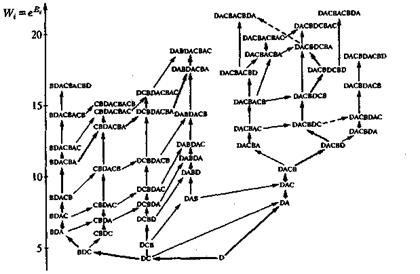 Показано, что на Праземле действительно установились перечисленные выше физические условия. Под воздействием ультрафиолетового излучения, высоких температур и электрических разрядов, выступавших в качестве источников свободной энергии, в восстановительной про-тоатмосфере, содержавшей водород, азот, водяной пар, метан, аммиак, двуокись углерода и т. д., могли образовываться аминокислоты, пиримидиновые и пуриновые основания, сахара, жирные кислоты и т.д. Следовательно, структурные компоненты биомолекул могли возникать спонтанно и в достаточных количествах. Показано также, что в этих условиях могла происходить полимеризация аминокислот в простейшие «заготовки» протеинов — так называемые протеноиды — и полимеризация нуклеотидов в более или менее длинные цепи. Под нуклеотидами мы понимаем основные структурные единицы нуклеиновых кислот, состоящих их пуриновых (аденина и гуанина) или пиримидиновых (цитозина, тимина к урацила) оснований, а также пентоз и фосфатных групп. Эти еще примитивные протеноиды и нуклеиновые кислоты образовывались преимущественно в водах, омывавших Праземлю. В свою очередь из них (главным образом из протеноидов) возникали компактные образования — так называемые коацерваты. Решающее значение имело то, что протеноиды обладали простыми каталитическими свойствами, хотя те были выражены в миллионы раз слабее, чем у современных ферментов. При каталитической поддержке протеноидов синтез полинуклеотидов должен был происходить интенсивнее, причем уже имевшиеся цепочки нуклеотидов служили матрицами для синтеза последующих цепочек. Таким или близким к описанному путем протополимеры обрели способность к самовоспроизведению. В результате ошибок при репродуцировании возникали все новые и новые структуры, которые в результате естественного отбора вступали между собой в конкуренцию. Выживали только такие, которые лучше всего приспосабливались к окружающей природной среде, обладали способностью к быстрому и относительно стабильному воспроизведению. На рис. 3 представлена формальная схема замещения структур нуклеиновых кислот новыми, все более совершенными. К строгому изложению предложенной Эйгеном концепции ценности мы сможем приступить лишь в последующих разделах. Упомянем пока лишь некоторые качественные аспекты. Способность нуклеиновых кислот к хранению информации (способность, в основе которой лежит мультистабильность первичных структур нуклеиновых кислот), несомненно, играет важную роль при определении «ценности» конкретной первичной структуры для процесса эволюции. «Ценность» с этой точки зрения должна быстро возрастать с увеличением длины v последовательностей и, следовательно, их информационной емкости W= λv